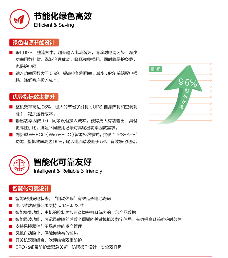 产品规格: 整机效率高达96%,极大的节省了能耗( UPS自身热耗和空调耗 能),减少运行成本。